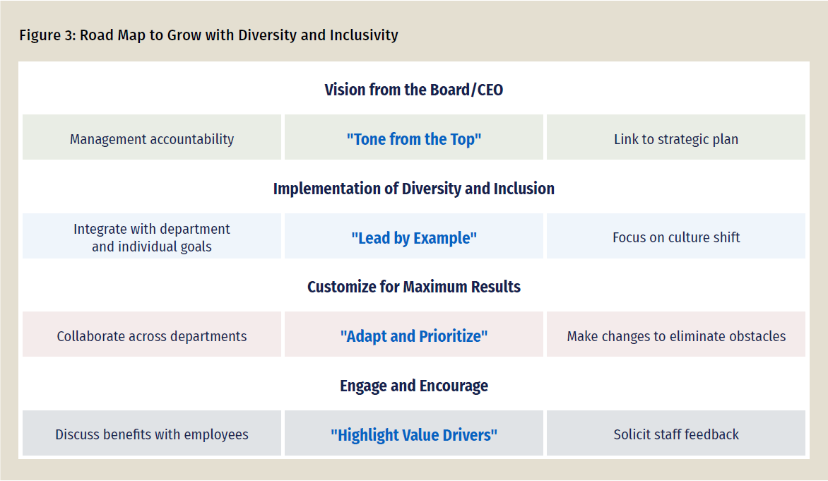 A bank’s succession plan should consider the positive impact of diversity in its leadership team on the organization. According to the Diversity of Thought study conducted by global executive search firm Heidrick & Struggles, surveying more than 230 senior board members from the top 400 publicly listed companies, 97 percent of high-ranking executives believe that diversity of thought is among the most important goals when leading successful companies.14 When determining the optimal composition of leadership, it is appropriate to be wary of “groupthink,” which characterizes how members of a leadership team with similar backgrounds tend to align in thought and gravitate to the same strategies. Team diversity slows the progression to groupthink by providing more capacity for alternative viewpoints.15 As noted in Figure 3, linking diversity to growth strategy ensures that value drivers16 are enabled and initiatives are properly prioritized, as a diverse group will more likely reevaluate information and remain even-handed.